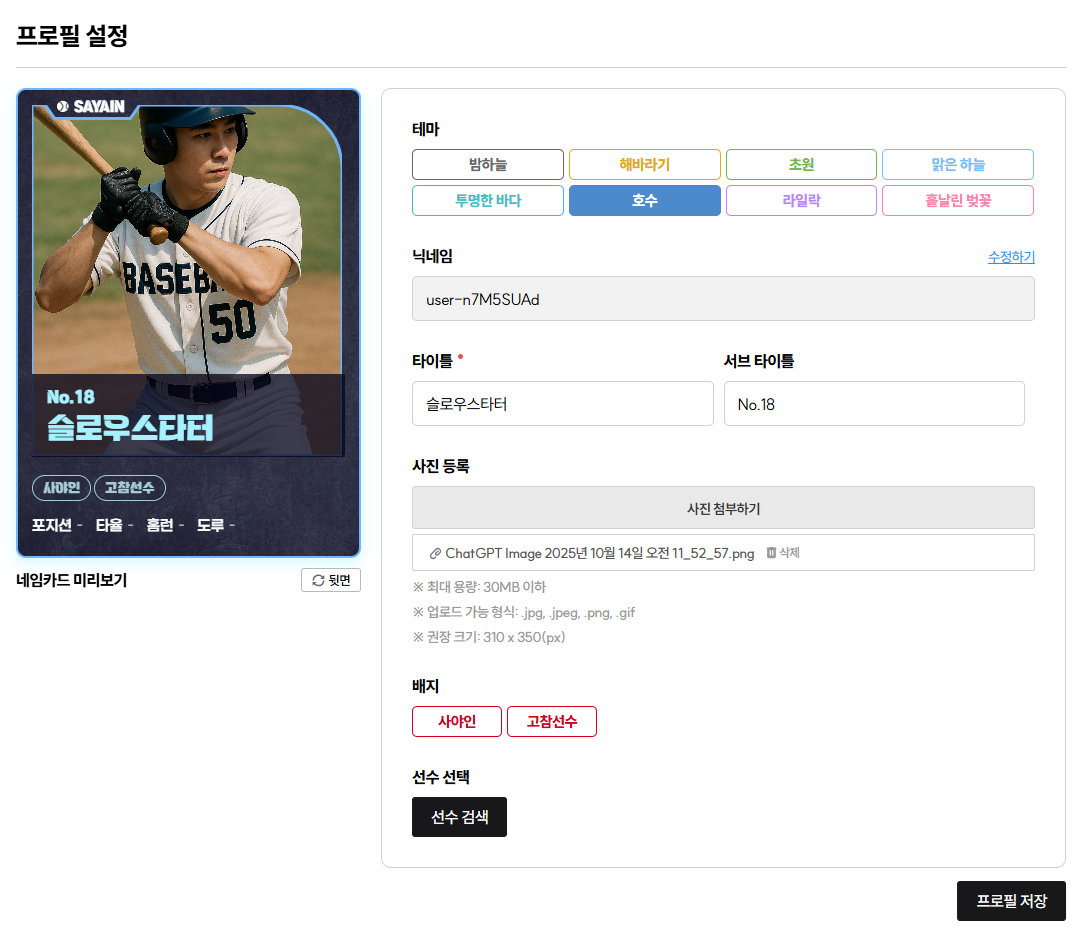 안녕하세요! 최근에 저희 팀원들끼리 네임카드를 만들어봤는데 생각보다 반응이 너무 좋아서 공유드려요. 제가 사용한 방법은 다음과 같아요 👇 1️⃣ 기본 템플릿 정해두고, 2️⃣ 선수 사진을 직접 업로드해서 완성, 3️⃣ 마지막엔 팀 로고랑 색상 포인트를 맞추면 진짜 프로 선수 카드 느낌 납니다. 팁: 사진은 밝은 조명에서 촬영하거나, 기존 증명사진 톤으로 맞추면 깔끔하게 나와요. 카드 배경은 잔디색(녹색) 또는 네이비색 계열이 인기가 많아요. 메인타이틀과 서브 타이틀을 넣으면 카드 느낌이 나서 더 좋은 것 같아요. 여러분은 어떤 스타일로 만들고 계신가요? 😄 → 이미지: 네이비색 배경의 야구 네임카드(중앙에 선수 사진, 하단에 스탯 3개, SAYAIN 로고 포함)