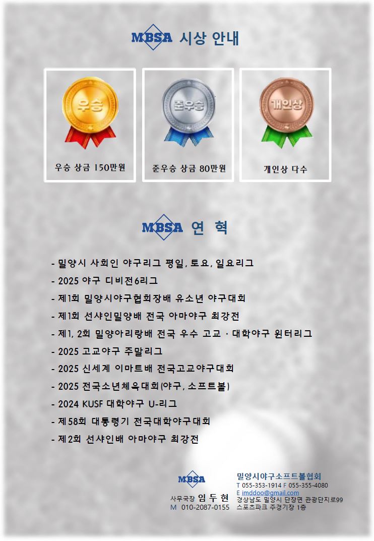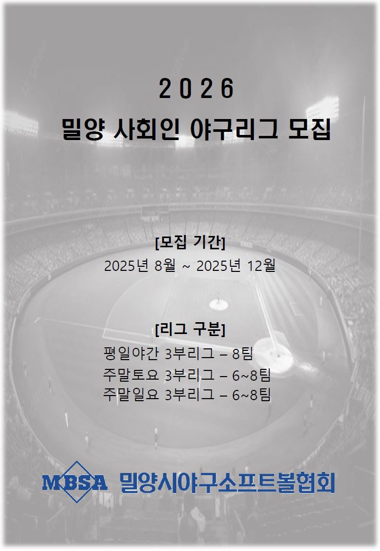 ☆ 2026년 밀양 사회인 야구리그 참가팀 모집 공지 ☆ 안녕하십니까~? 밀양시야구소프트볼협회 사무국 입니다. 정직하고 성실한 협회와 함께 최신시설의 야구장에서 열정적으로 야구경기를 해주실 모든 사회인 야구팀을 모집합니다. 하기내용 참고 바랍니다. 감사합니다. *홈페이지 : https://www.mbsa.co.kr