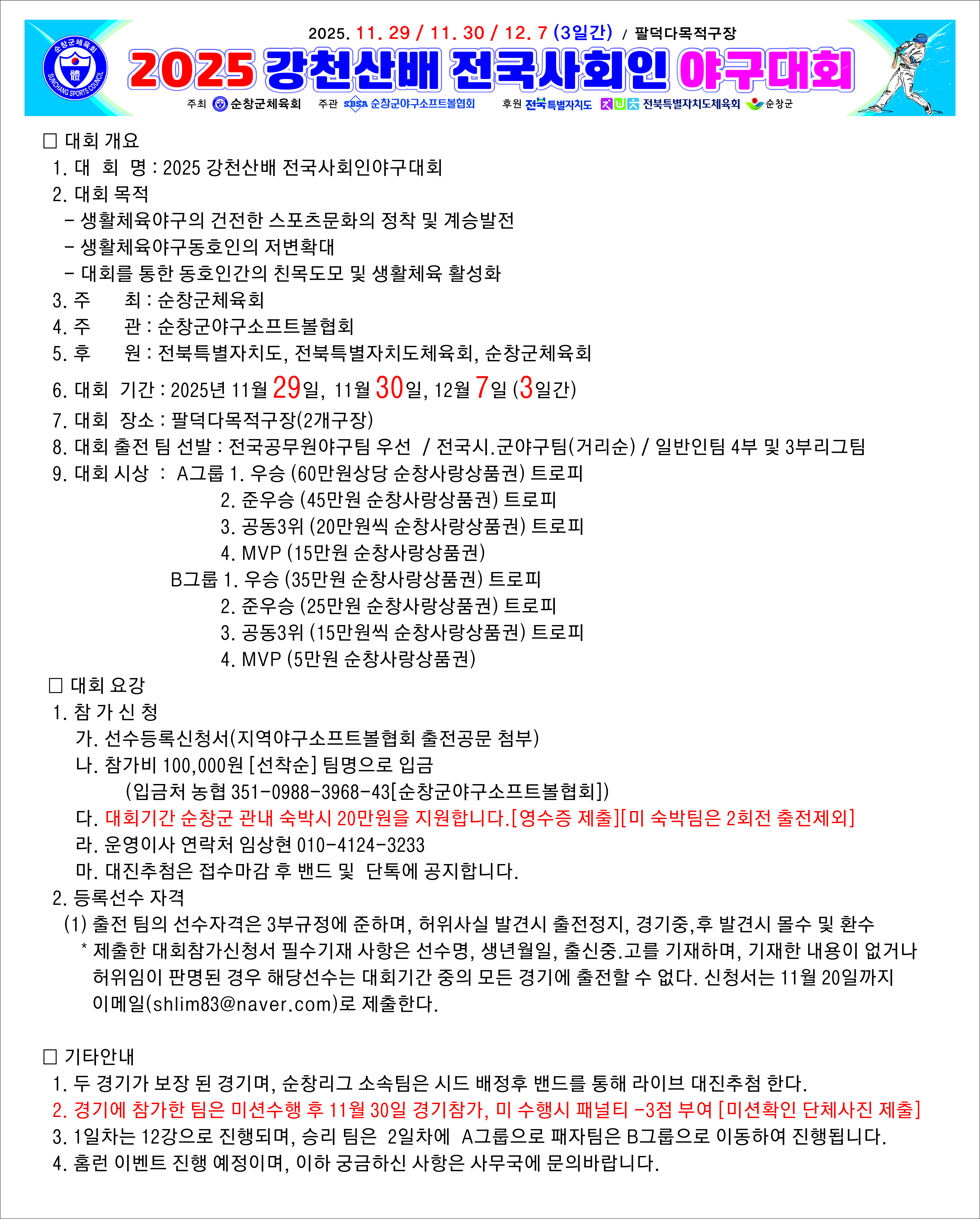 순창군 강천산배사회인안구대회 대회일시 : 11월 29일(토), 30일(일), 12윌 7일(일) - 3일간 두경기 보장 된 경기이며, 숙박비 20만원 각 팀에 지원됨.